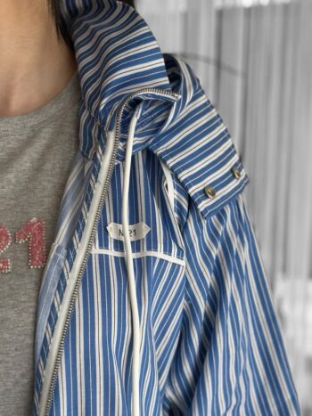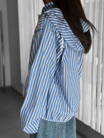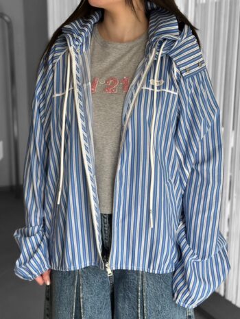 ホワイト×ブルーの清々しいカラーのストライプ、取り外し可能なフーディー。