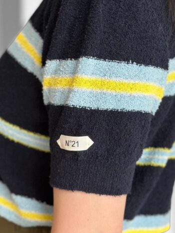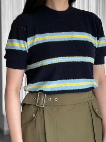 ネイビー × ブルー × レモンベージュの 複雑なボーダーストライプディテールが