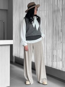 グレーニットベストのレイヤードスタイルに